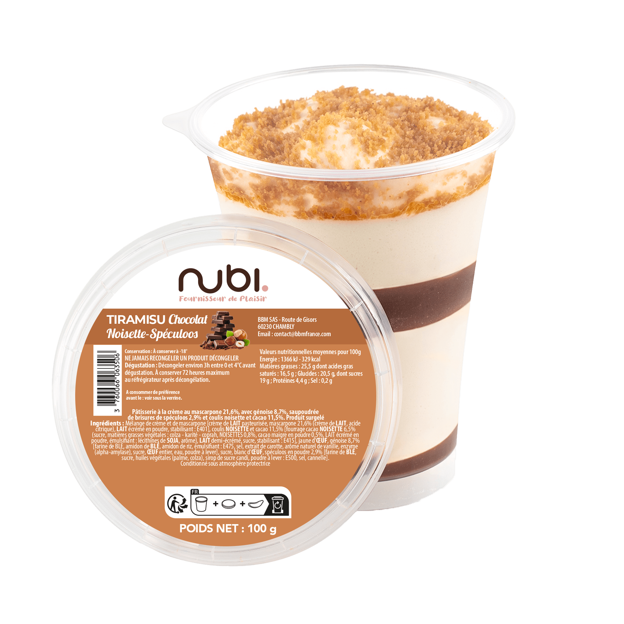 Offrez-vous une pause gourmande avec le tiramisu Nubi au chocolat, noisette et spéculos. Sa texture onctueuse, mêlant crème légère, morceaux de spéculos et notes chocolatées, procure un plaisir gourmand à chaque cuillerée. Prêt à déguster, ce dessert individuel de 100 g est parfait pour combler vos envies sucrées en toute simplicité.